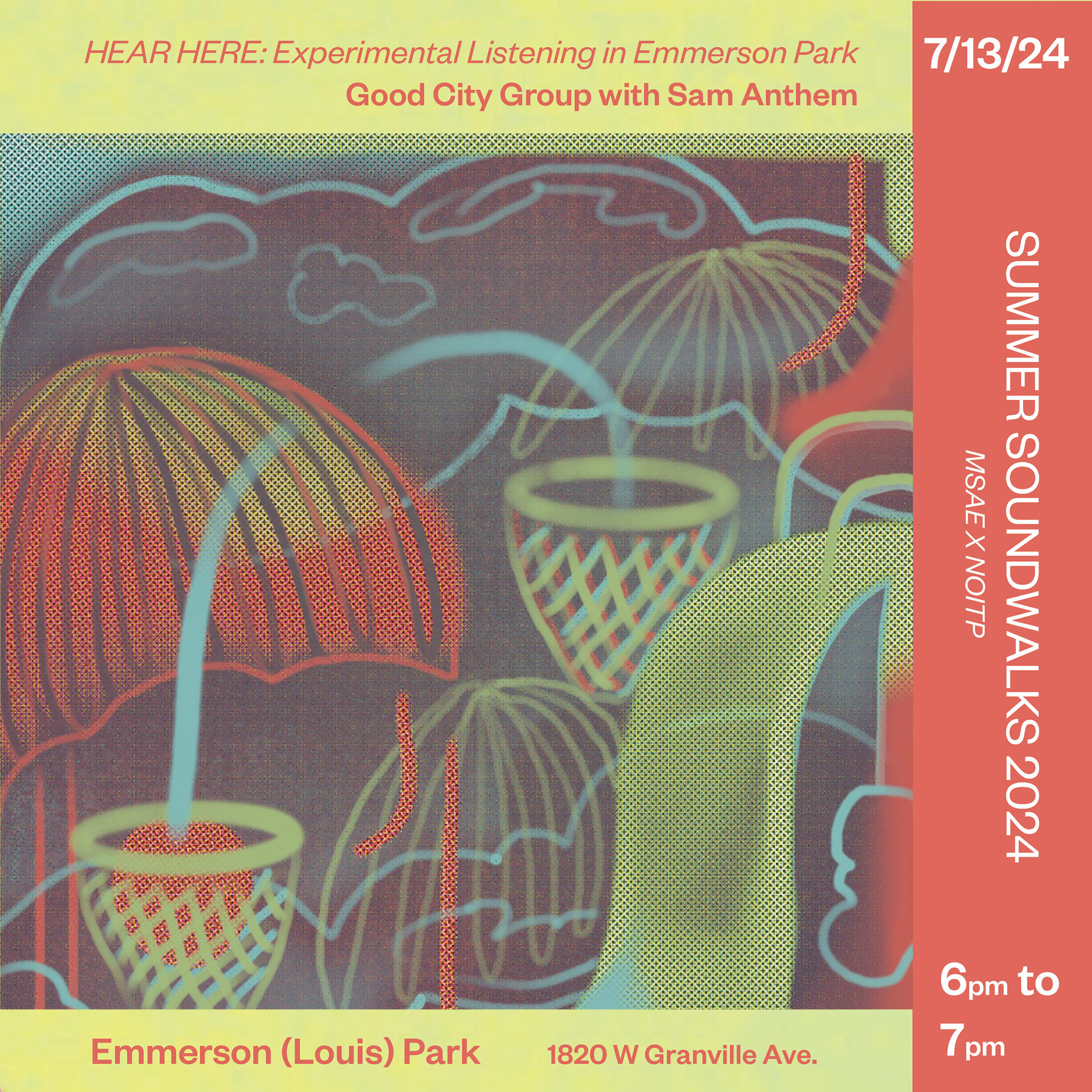 Promotional Graphics and Illustration for the Summer Soundwalk Series of 2023, 2024 and 2025 with the Midwest Society for Acoustic Ecology and Chicago Park System's "Night Out in the Parks" program.